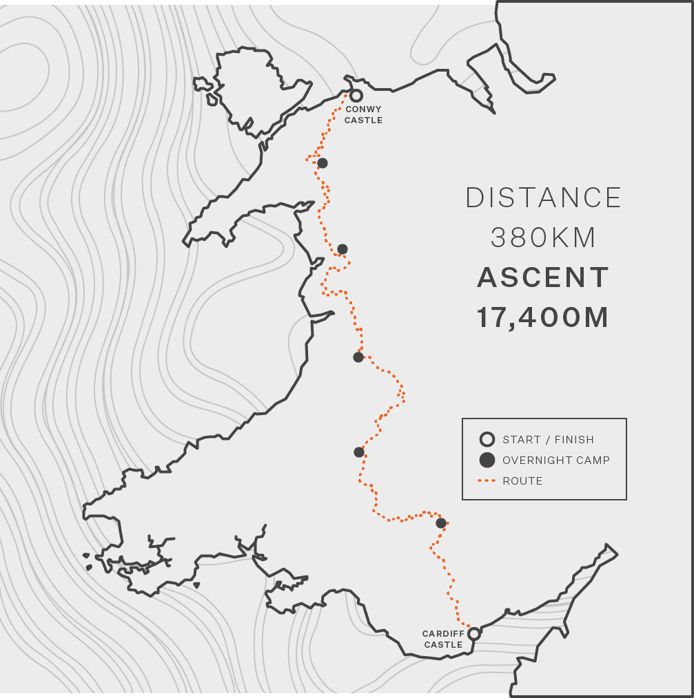 Spanning over 6 days and 5 checkpoints, the Dragons Back Race takes participants on a gruelling multi stage mountain challenge. Heading from the north to the south, the route traverses 2 of Wales’ National Parks, Snowdonia and the Brecon Beacons - as well as countless lesser-visited peaks along the way.