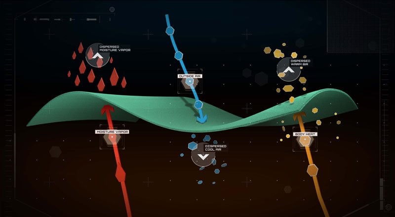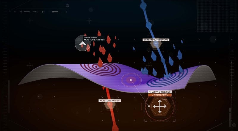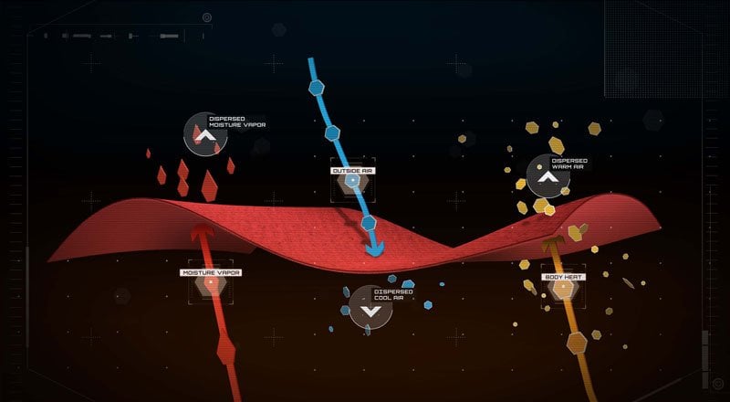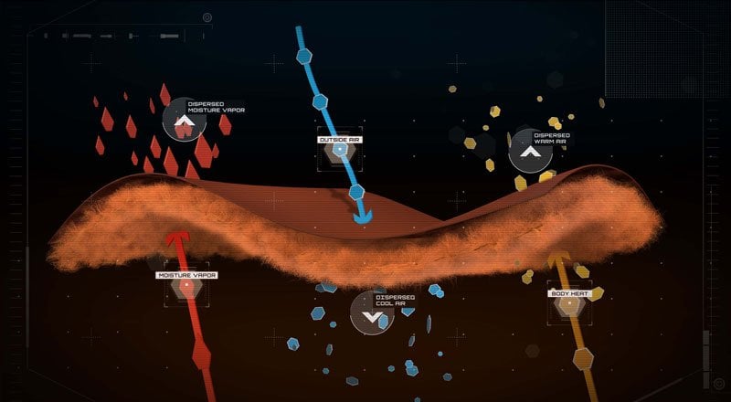 This bi-component fabric technology is constructed with a hydrophilic interior to pull moisture away from the skin and transfer it to the outer layer. Power Dry’s exterior surface area disperses and releases this moisture for more efficient dry times. Continuous evaporation prevents saturation and regulates temperature in both hot and cold conditions.