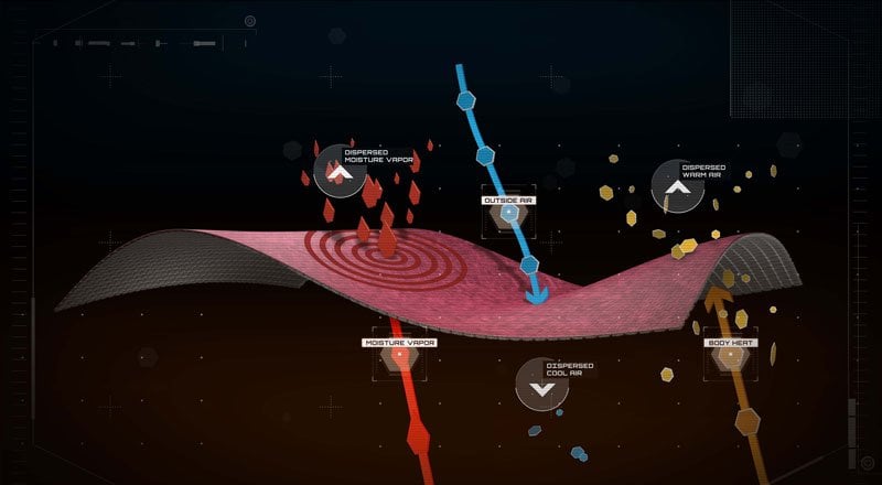 With geometric constructions to generate targeted touch points for our patented bi-component design to manage moisture. The next-to-skin surface is hydrophilic to absorb sweat vapour and transfer it outside. Then the outer surface disperses moisture for more efficient evaporation. The grid design also creates open air channels that improve breathability and reduce fabric mass.